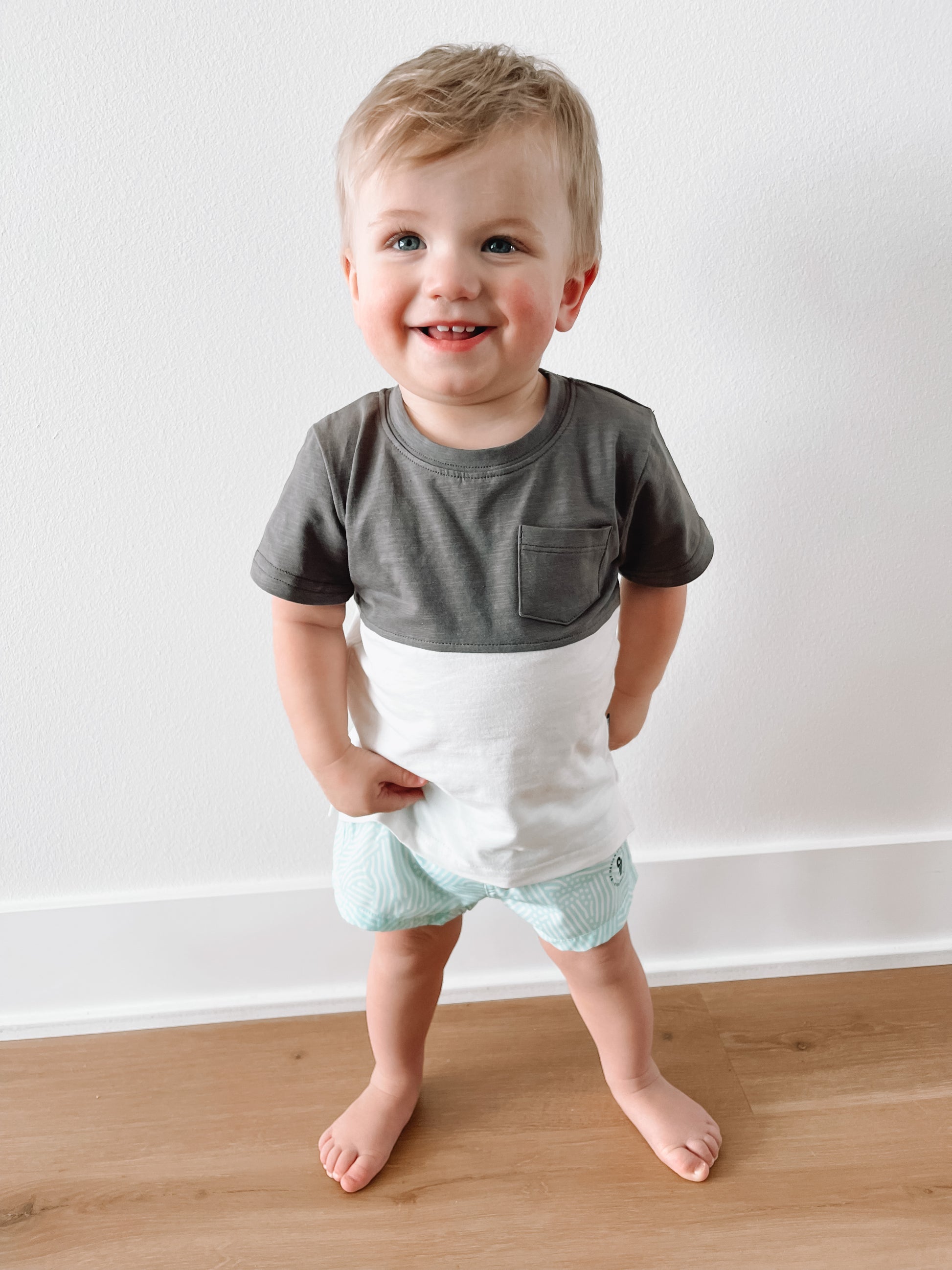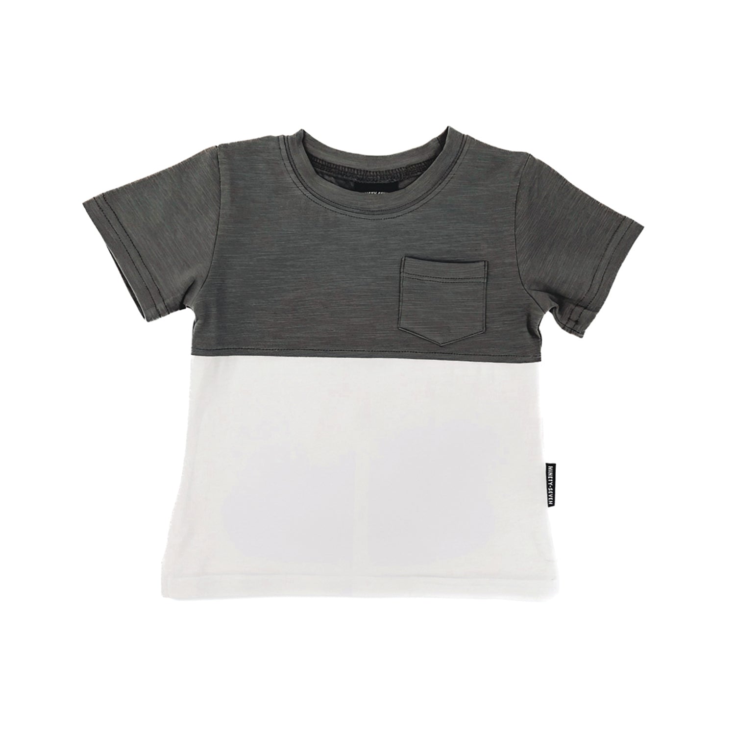 Our new color block pocket tees will come in 3 different color options. They are buttery soft, and the modern color block design will be stylish on any kid.