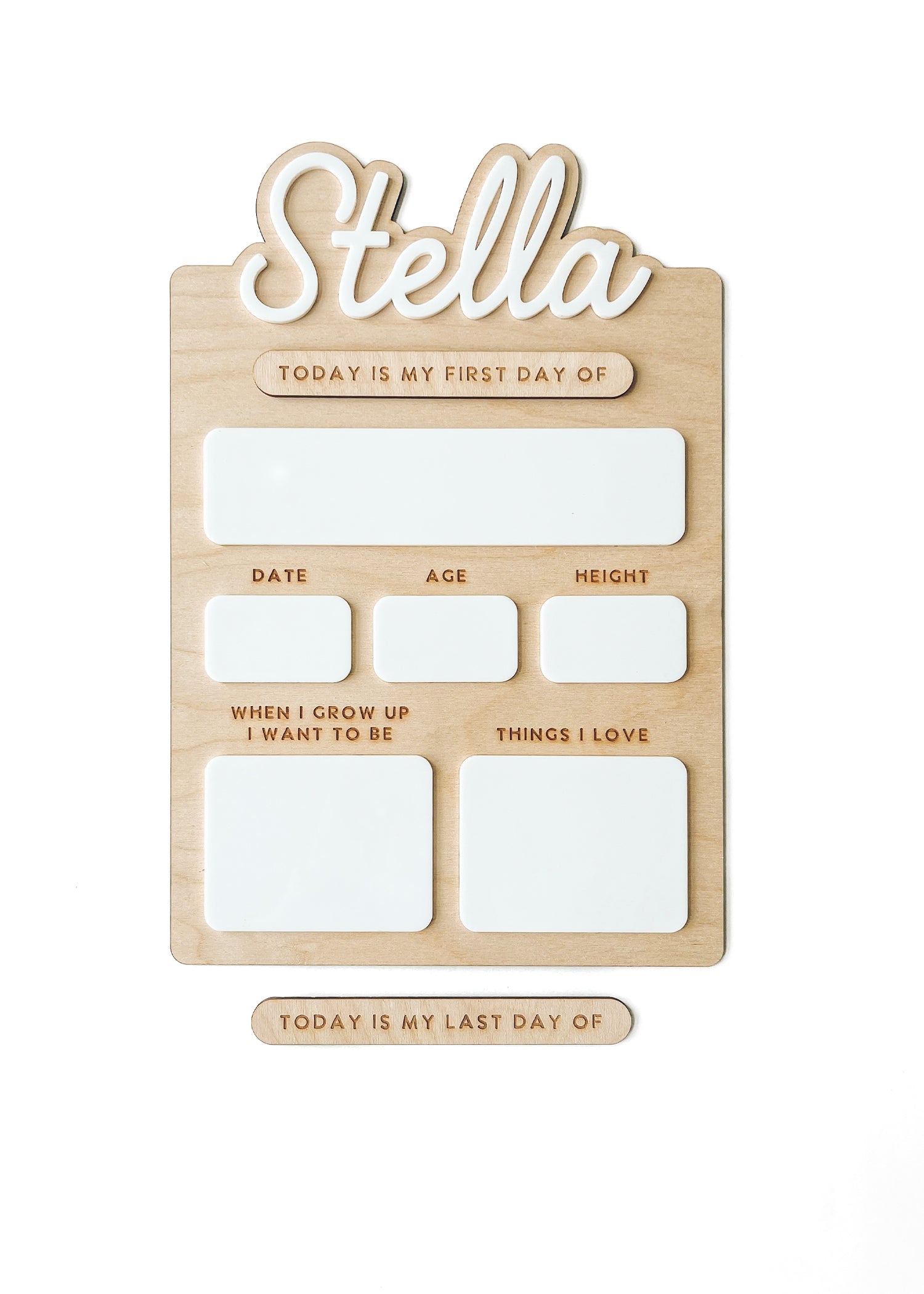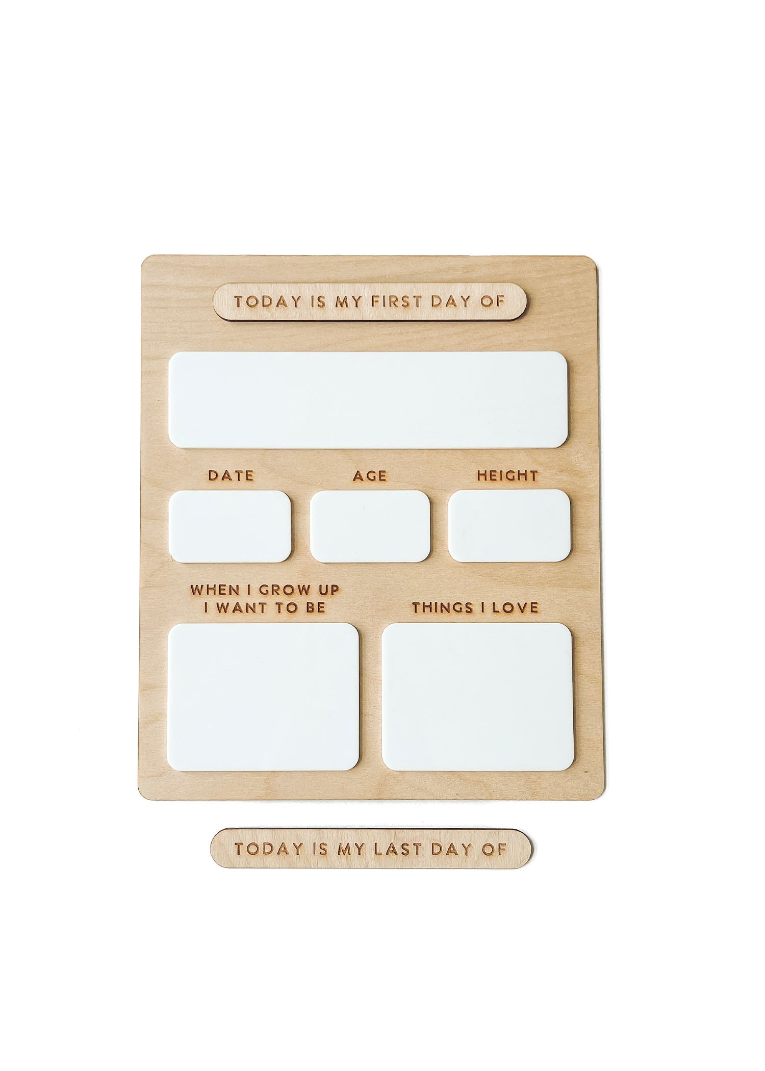 Signs are made from Birch Plywood and Acrylic. Each will include an interchangeable "First Day / Last Day" piece.