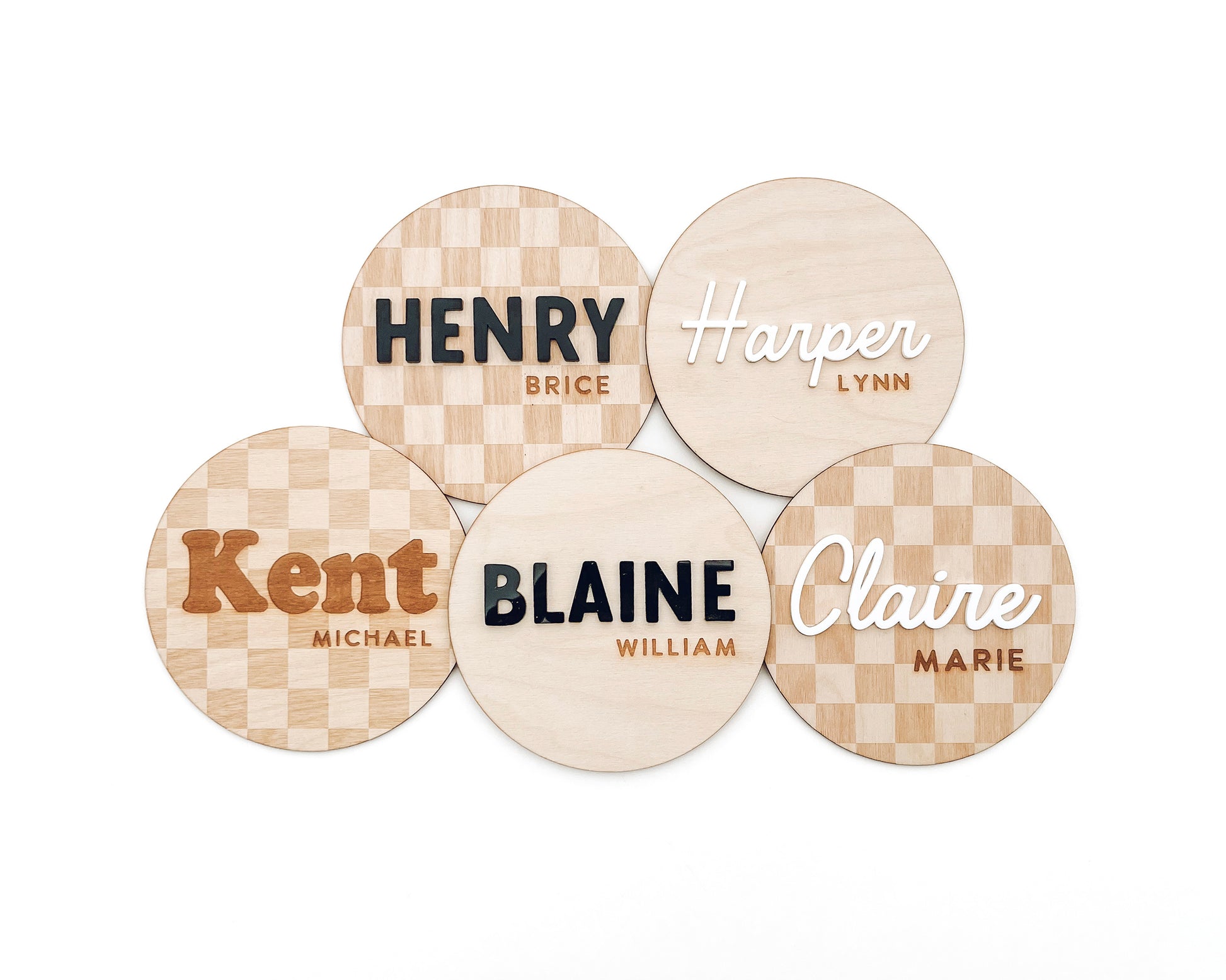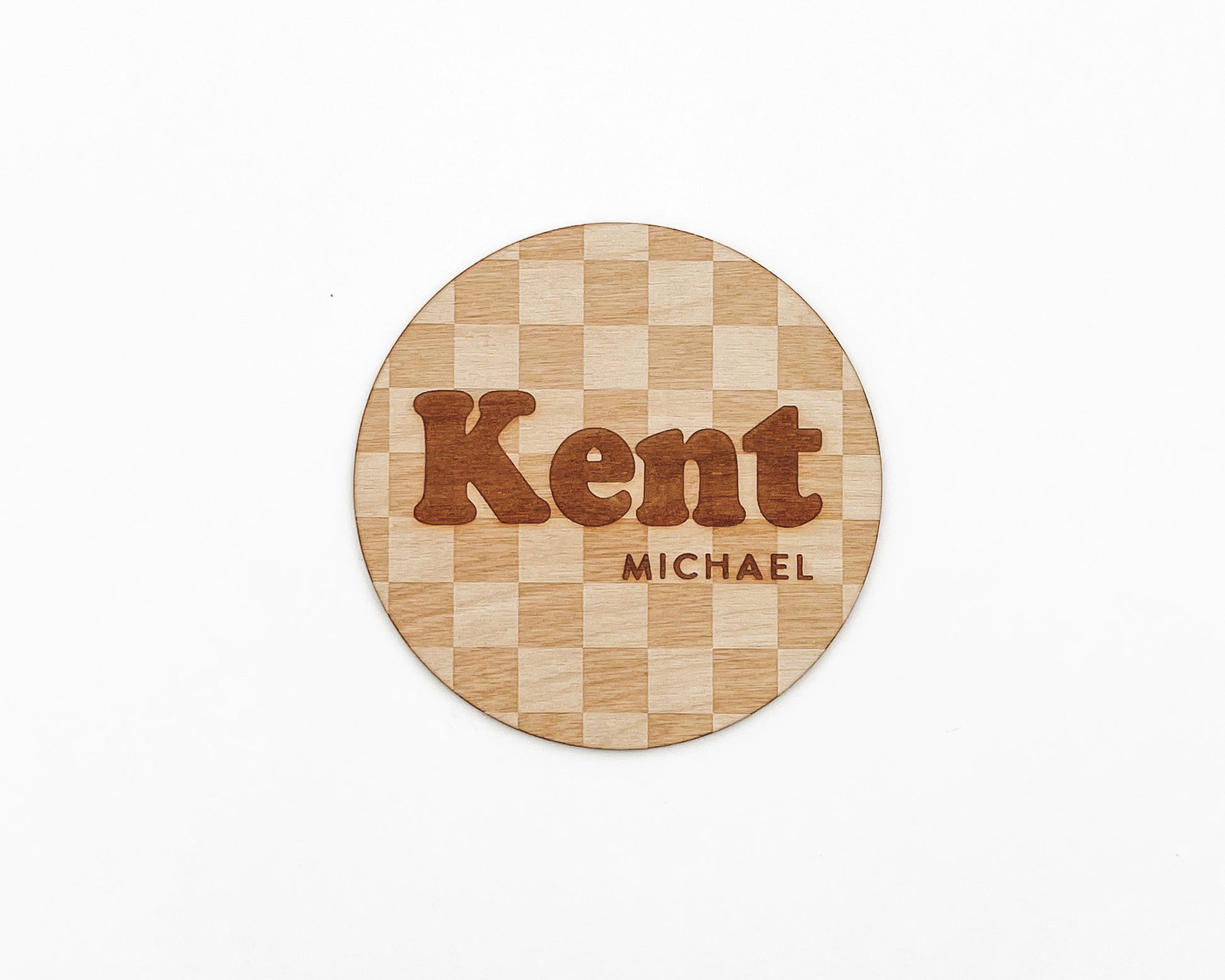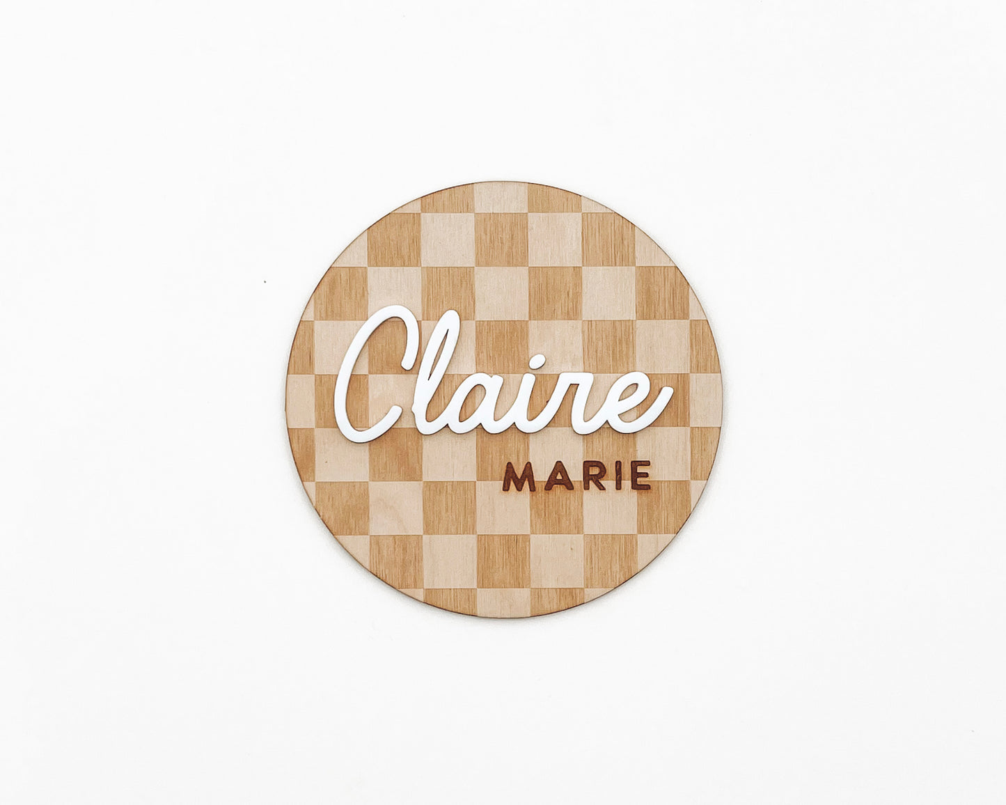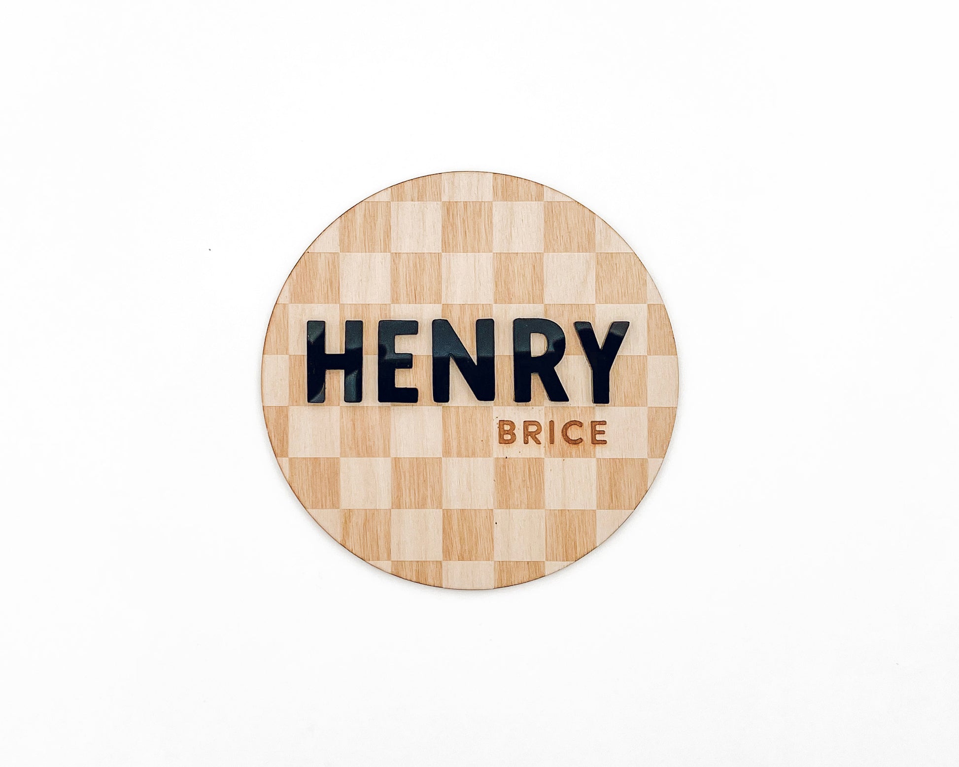Customize name from 3 different font options and your choice of name being engraved or have black or white acrylic. Signs also have an option of having a plain or checker background.