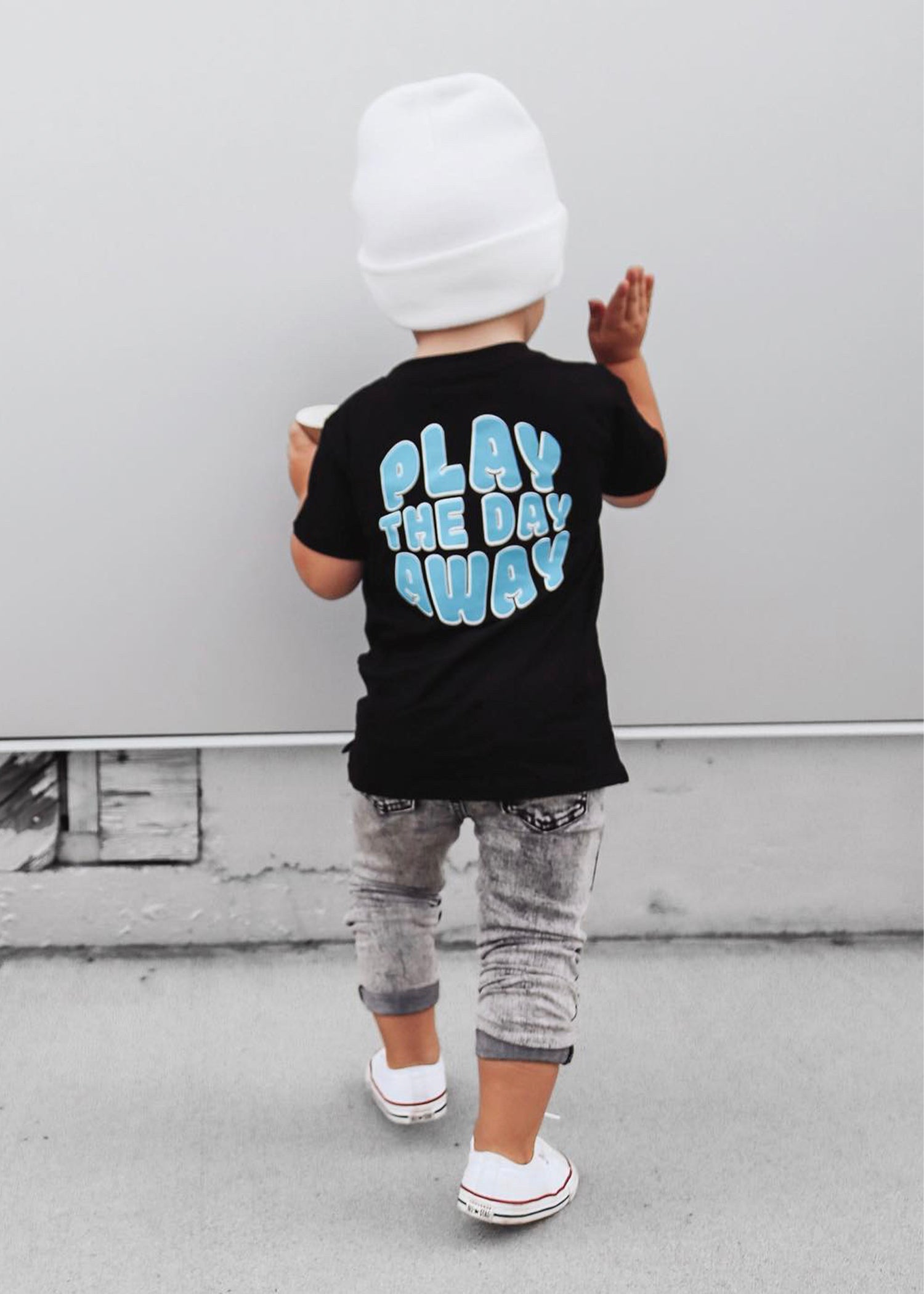"Play The Day Away" is part of our timeless collection. This shirt is a modern and minimal design tailored to all kids.